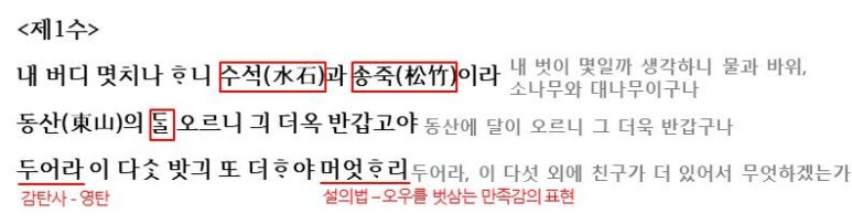 <제1수>는 앞에서 말한 것과 같이 문답을 통해 다섯 벗에 대해 이야기 하는 구조를 가지고 있습니다.