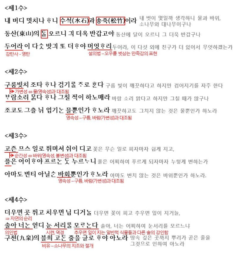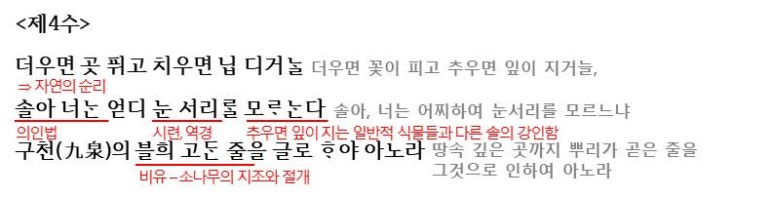 <제4수>에서는 더우면 꽃 피고 추우면 잎이 진다는 자연의 순리에 대해 말하면서 시작하는데요. 이는 일반적인 사물은 이렇게 순리에 따르지만 '소나무'는 이런 일반적인 사물과는 달리 더위나 추위 등의 시련에도 견디는 모습을 보여줍니다. 그리고 이를 통해 소나무의 뿌리가 땅속 깊은 곳에 뿌리를 곧게 뻗고 있음을 드러내며 지조와 절개라는 가치를 대응시켜 예찬하고 있습니다.(여기서 소나무를 '너'라고 부르며 의인화함으로써 소나무에 대한 친밀감을 드러내고 있습니다)