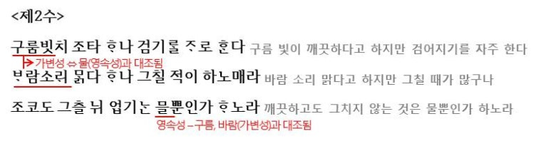 <제2수>에서는 얼핏 좋아보이지만 오래 가지 못하는 가변성을 가진 구름과 바람소리를 '물'과 대조하며 늘 같은 속성을 가진 '물'을 찬양하고 있습니다.