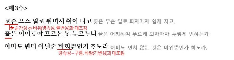 <제3수>는 <제2수>와 같은 구조로 되어 있는데요. 얼핏 좋아보이지만 변하는 꽃과 풀을 변하지 않는 바위와 대조하여 바위의 변하지 않는 영속성에 대해 예찬하고 있습니다.