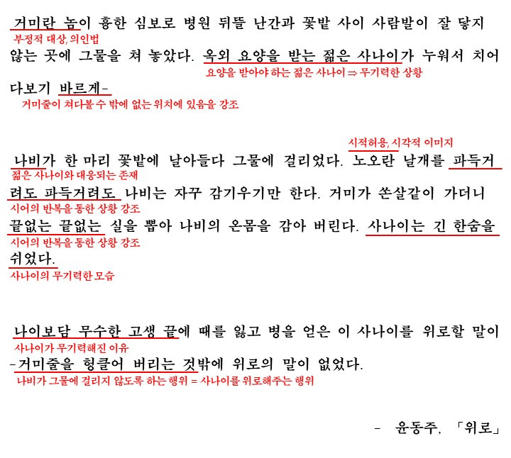 이번에 다룰 작품은 윤동주 시인의 '위로'입니다. 시에 제목에서 알 수 있듯이 이 작품은 어떠한 대상을 위로하는 내용을 담고 있는데요. 시적화자가 위로하려는 대상은 누구인지 그리고 어떤 상황인지를 생각하며 시를 읽은 후 해석을 통해 학습해보도록 합시다.