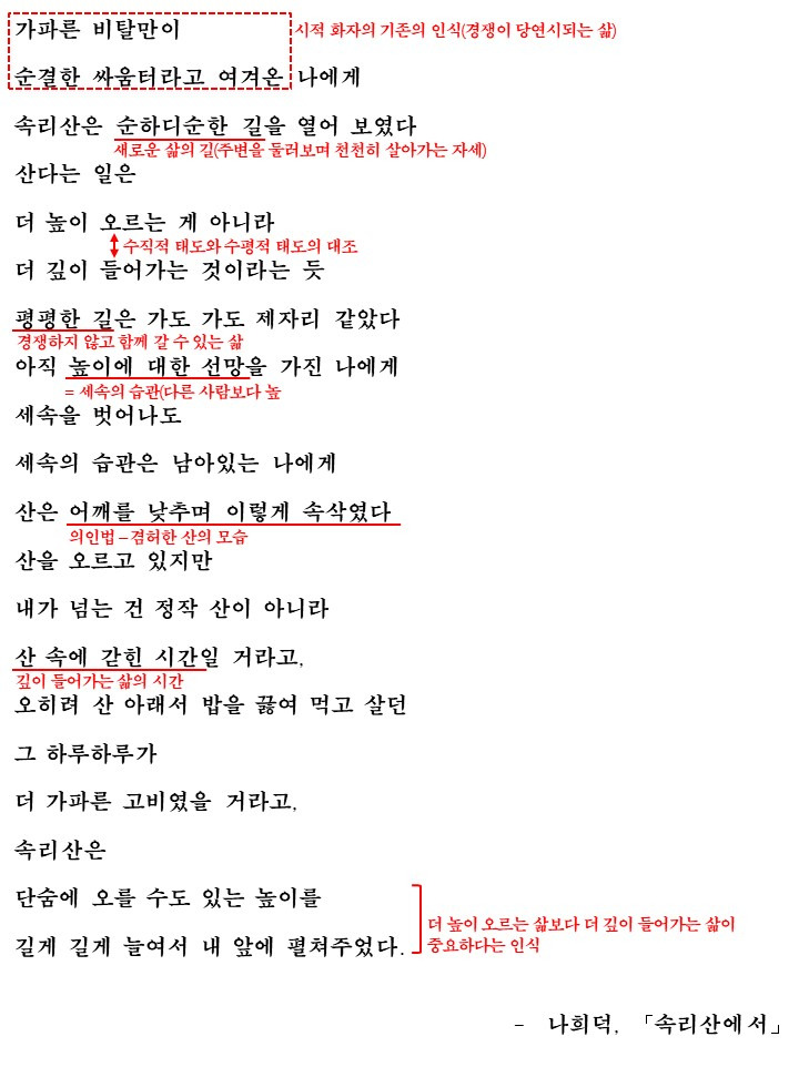 시의 처음에서 화자의 기존의 인식이 드러납니다. '가파른 비탈만이 순결한 싸움터라고 여기는' 그런 화자의 태도는 경쟁이 당연한 경쟁해서 앞장서서 나가는 것이 당연한 그런 삶을 살아왔다는 것을 알 수 있습니다. 그런 '나'에게 속리산은 새로운 삶의 자세를 알려줍니다. 경쟁하면서 사는 것이 아니라 순하디순한 길 즉, 주변을 둘러보며 천천히 살아가는 자세를 말이죠. 이렇게 해서 이 시는 속리산을 의인화해서 경쟁하지 않고 주변을 둘러보며 자신의 삶을 돌아보는 삶의 자세를 말해줍니다. 아직도 경쟁하는 삶의 태도를 버리지 못한 화자지만 산은 어깨를 낮추며 계속해서 속삭여줍니다.
