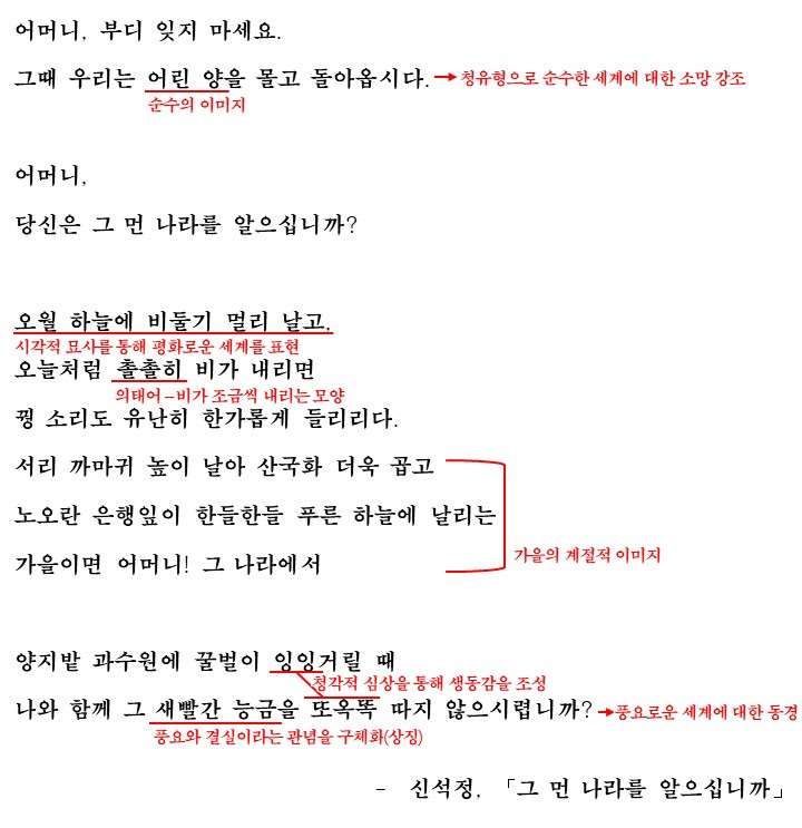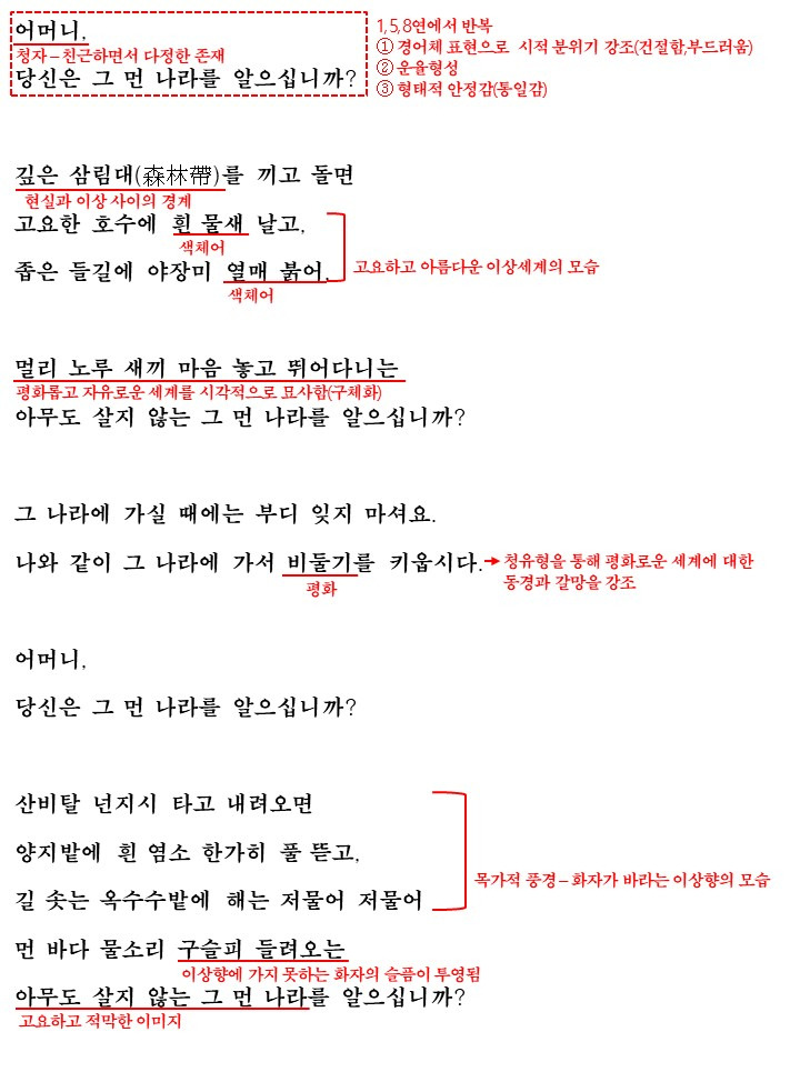 시는 '어머니, 당신은 그 먼 나라를 알으십니까'로 시작되며 이 연은 5, 8연에서도 반복되며 시적 분위기를 강조합니다.(그리고 이 질문을 기점으로 시가 세 부분으로 나뉘는 구조도 가지고 있습니다) 그리고 독자에게 그 먼나라가 어떤 나라인 궁금증을 자아내게 합니다.(읽는 이를 집중시키는 효과)