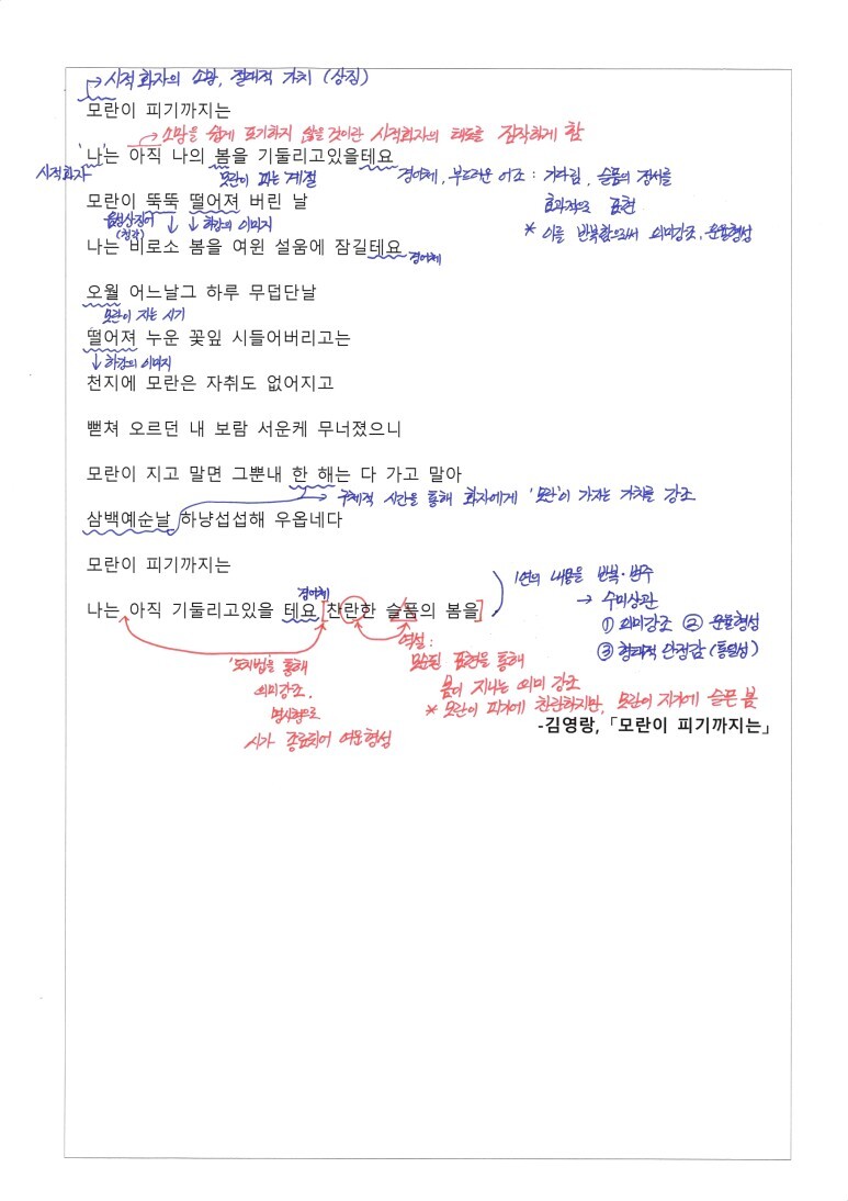 1. 시에서 모란은 핀적이 없다. 때문에 화자는 늘 기다리는 슬픔의 정서와 태도를 일관적으로 보이고 있다.
