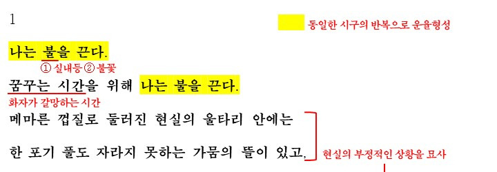 위에 언급된 것과 같이 꿈꾸는 시간을 위해 불을 끄는 화자. 여기서 "나는 불을 끈다"는 시구는 전체적으로 반복되며 화자의 의지를 강조함과 동시에 운율을 형성하고 있습니다.(여기서 불은 실내등으로 볼 수 있지만 시 전반적인 내용을 보면 생명을 소멸시키는 불을 끄고자 하는 것으로도 볼 수 있을 것 같습니다) 화자가 꿈꾸는 시간으로 가고자 하는 이유는 바로 제시되는데요. '메마른 껍질, 가뭄의 뜰'이라는 시어에서 알 수 있듯이 현실이 부정적이여서 화자는 꿈꾸는 시간으로 가고자 합니다.