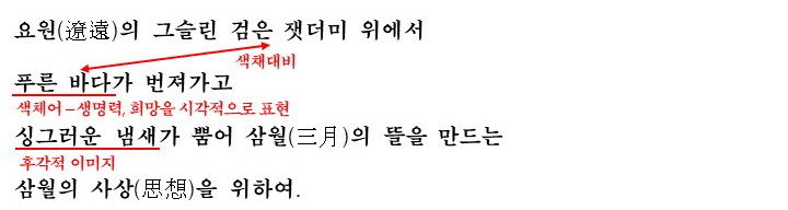 이렇게 밝혀진 꿈 속에서는 검은 잿더미 위에 푸른 바다가 번져가며 싱구러운 냄새를 뿜어 삼월의 뜰을 만드는데요. 푸른 바다와 삼월은 모두 생명력을 상징하는 것으로 화자가 원하는 생명력이 넘치는 세상을 뜻하는 것으로 볼 수 있습니다.