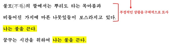 다음 연에서는 위에서 언급된 부정적인 상황이 구체적으로 묘사됩니다. 뿌리도 타는 목마름, 마른 나뭇잎 등 생명력이 부족한 부정적인 상황이 구체적으로 묘사되며 화자가 불을 끄고 꿈꾸는 시간으로 가고자 하는 이유가 구체화 됩니다.