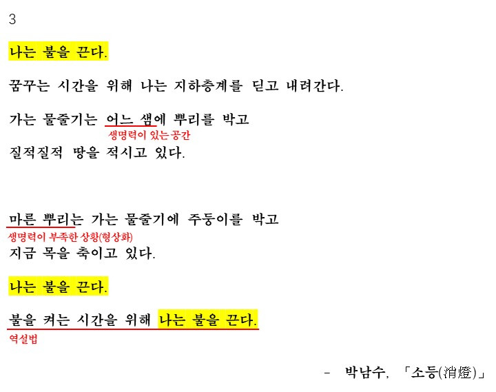 마지막으로 화자는 다시 불을 끄는데요. '이번에는 불을 켜는 시간을 위해 불을 끕니다' 역설적인 이 표현은 불을 끔으로서 생명력이 있는 꿈의 시간으로 가고 다시 불을 켰을 때 부정적인 현실이 긍정적으로 바뀌기를 바라는 화자의 모습을 드러낸다고 할 수 있습니다.