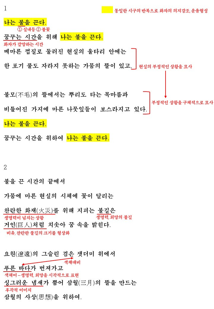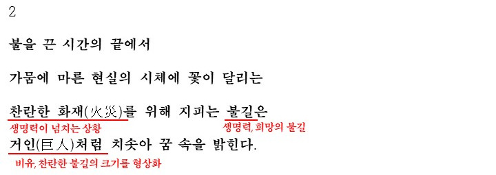 불을 끈 시간의 끝에서 화자는 꿈 속에 들어가고 그 꿈속에서는 마른 현실을 밝혀주는 불길이 치솟아 꿈속을 밝혀줍니다. 여기서의 불길은 찬란한 화재를 위해 지피는 커다란 불꽃으로 생명력을 상징하는 것으로 볼 수 있습니다.