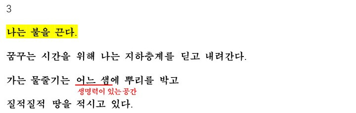 3에서는 다시 현실로 들어와 화자의 생각이 드러납니다. 화자는 꿈꾸는 시간을 위해 지하층계를 딛고 내려갑니다. 그 곳에서는 '가는 물줄기'가 '어느 샘'에 뿌리를 박고 질적질적 땅을 적시고 있는데요. 여기서 '물'이 생명력을 상징하는 것으로 나타나며 가는 물줄기는 이 샘에 뿌리를 박고 땅을 질적질적 생명력을 퍼트리고 있습니다.