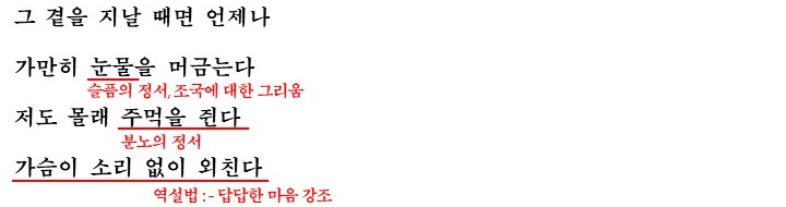 그래서 화자는 그 소나무 곁을 지날 때 언제나 눈물을 머금습니다. 고향에 대한 그리움을 느끼면서 슬퍼지는 것이죠(북...북한 주민들의 사정을 보면 그럴만도 하죠?). 그리고 분노를 느낍니다.(북한 사정을 보면 화날만도 하죠? 고향을 떠날 수 밖에 없는 현실에 대해 화자가 느끼는 감정입니다) 그리고 답답함을 표현합니다(역설법을 통해 강조)