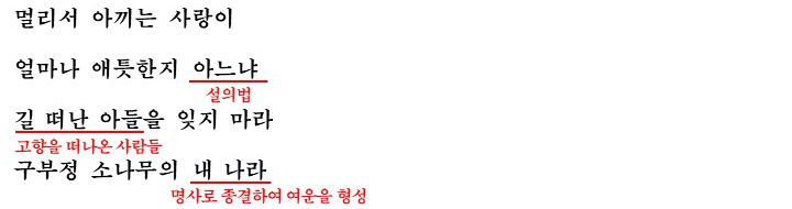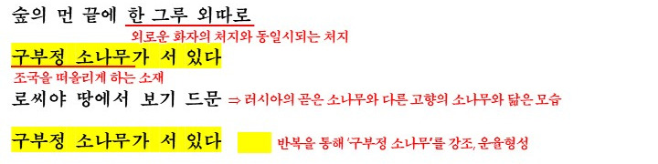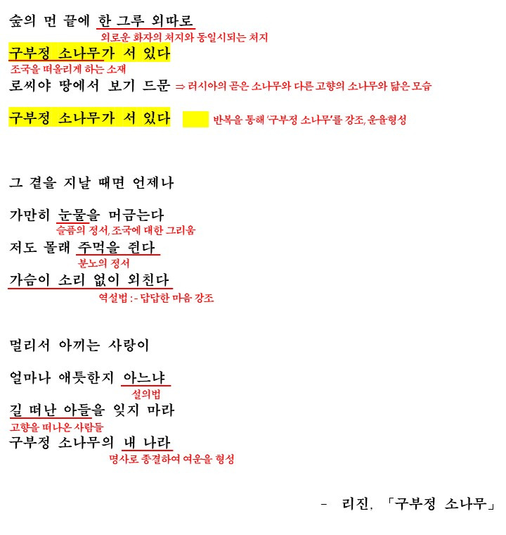 그리고 떠나 온 조국에 대한 애틋함을 강조하며 구부정 소나무를 통해 조국을 그리워하고 있습니다.