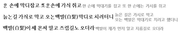 이 작품에서는 한손에 맥대 잡고 한손에 가시를 잡으면서 늙음을 막으려는 모습이 드러나는데요. 노화라는 추상적인 대상을 늙는 길이라는 구체적인 대상으로 비유하여 표현하여 구체화하며 이렇게 노력했더니 먼저 알고 지름길로 오더라라며 해학적으로 노래한느데요 이는 흐르는 세월을 어찌할 수 없는 인간의 마음을 해학적으로 노래한 것으로 볼 수 있습니다. 이렇게 이 시는 해학을 통해서 늙음의 서글픔을 여유있게 받아들이고 있는 것이죠.