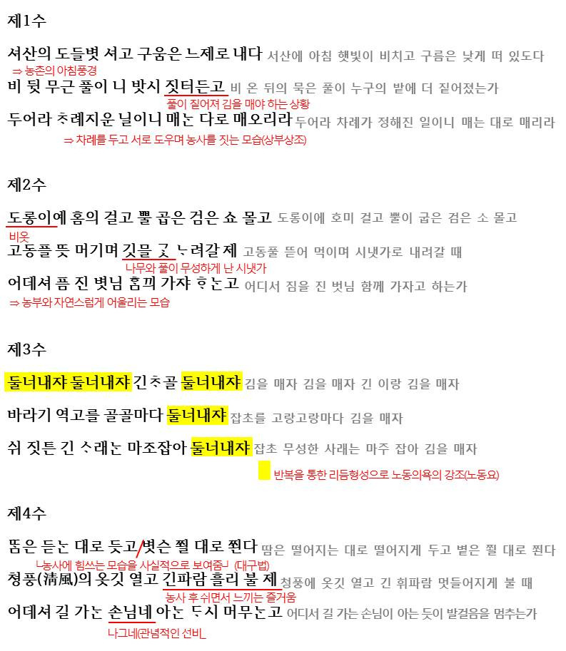 제1수에서는 아침에 김을 매러 일터로 나가는 모습이 드러납니다. 아침 햇빛이 비치는 농촌의 아침이 제시되며 김을 매어야 하는 상황이 드러납니다. 비 온 뒤 풀이 누구의 밭에 더 났는가를 말하면서도 차례가 정해졌다며 서로를 도우며 농사를 짓는 모습을 보여줍니다.