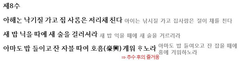 제8수에서는 추수후에 여유롭게 새 밥을 먹으며 즐거워하는 모습을 보여줍니다. 새로 추수한 곡식으로 차린 음식을 먹는 모습이 제시되며 흥에 찬 화자의 모습이 드러나는 부분입니다.