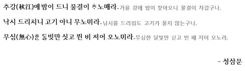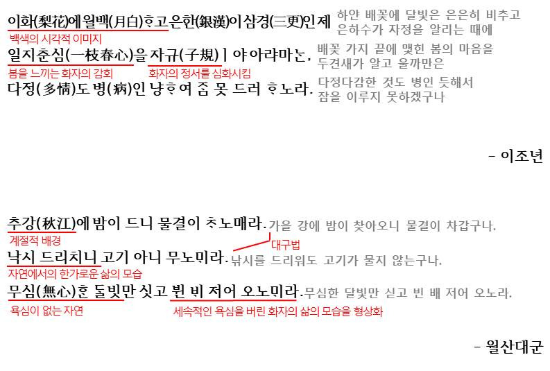 그럼 이제 전문해석을 통해 두 시조를 다시 보며 학습을 마무리해보도록 합시다.