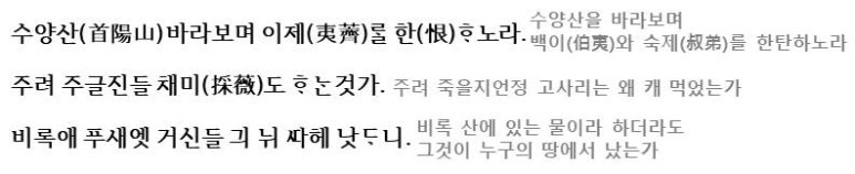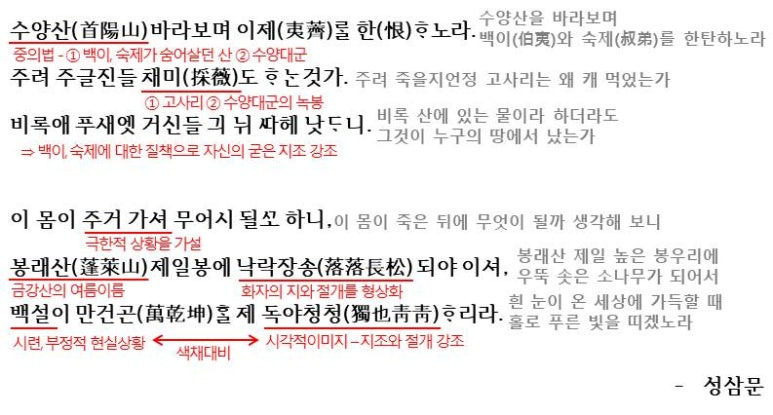 이 작품은 중국 은나라의 충신인 백이와 숙제의 절개도 자신에게 미치지 못함을 표현한 작품입니다. 작품 속에서 보통은 충신의 대명사로 불리는 백이와 숙제를 보며 숨어살 것이라도 왜 이제는 주나라의 것이 된 땅에서 난 고사리를 캐어 먹었냐며 한탄하며 자신이라면 굶어죽을지언정 그 채미도 먹지 않겠다는 굳은 의지를 나타내고 있는데요 이를 통해 자신이 백이, 숙제보다 더 굳은 지조를 지녔음을 강조하고 있습니다.
