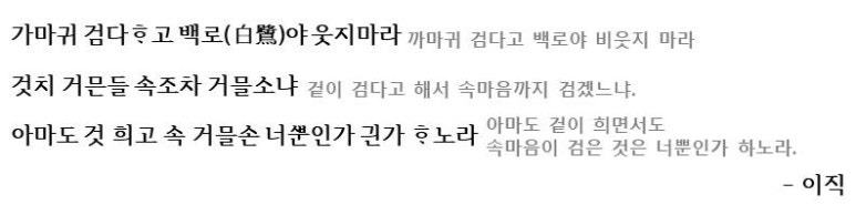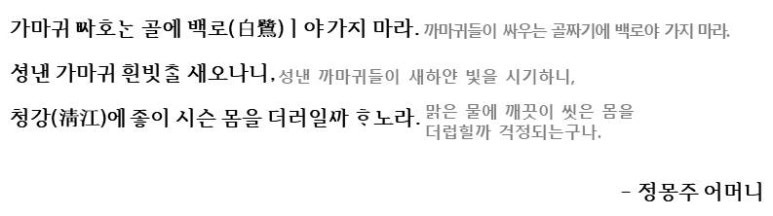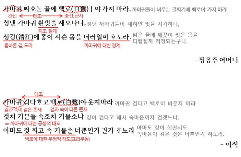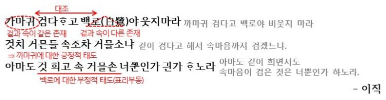 현대어 풀이까지 해서 읽어보면 위의 작품에서는 까마귀를 일반적인 인식과 같이 부정적으로 백로를 긍정적으로 인식하며, 아래에서는 반대로 까마귀를 긍정적으로 백로를 부정적으로 인식하는 것을 알 수 있습니다.