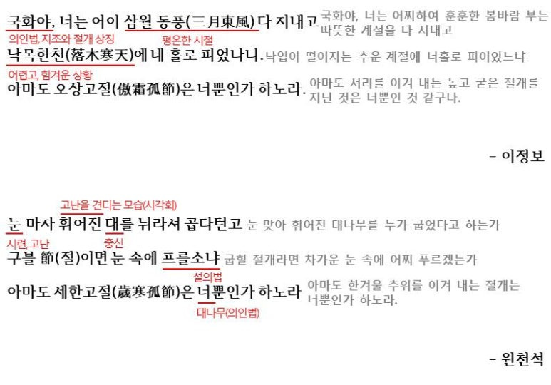 여기서 낙목한천은 어렵고힘겨운 상황(삼월동풍과 대조)을 의미하는데 이 낙목한천이 국화의 절개를 더욱 두드러지게 하고 있는 점이 특징입니다.(다른 꽃들과 다른 국화의 특징) 이렇게 이 시는 국화를 의인화하여 예찬하며 '선비의 높은 절개와 지조'에 대해 말하고 있습니다.