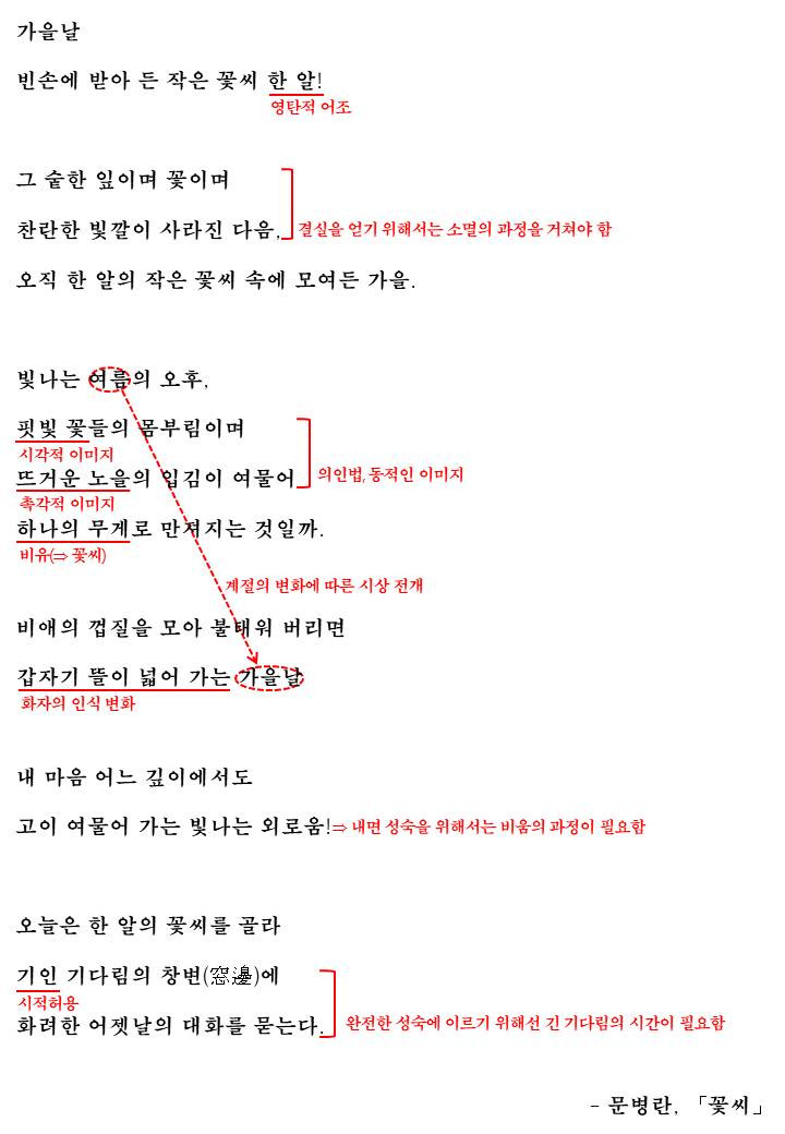 이번에 다룰 작품은 문병란 시인의 '꽃씨'입니다. 이 시에서는 처음부분에 나타난 것처럼 '가을날 빈손에 받아 든 작은 꽃씨 한 알'을 시작으로 꽃씨를 보며 느끼는 화자의 인식변화를 나타내고 있는데요. 화자의 인식이 어떻게 변해가고 있는지를 생각하며 시를 감상한 후 해석을 통해 학습해보도록 합시다.