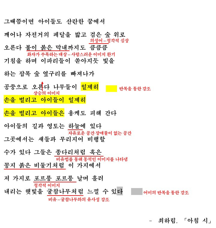 이번에 다룰 작품은 최하림 시인의 '아침 시'입니다. 아침은 하루 중 가장 활력이 넘치는 시간인데요. 이러한 아침에 '시'를 붙인 이 시의 제목의 의미를 생각하며 화자가 굴참나무와 아이들의 모습을 통해 무엇을 말하려고 하는지에 대해 생각하며 시를 읽은 후 해석을 통해 학습해보도록 합시다.