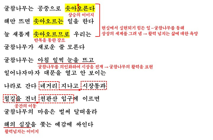 이 시를 보면 전반적으로 굉장히 동적인 느낌이란 것을 느낄 수 있습니다. 처음부터 굴참나부가 솟아오르는 모습을 반복해서(새로운 줄 모를 정도로 늘 새롭게 솟아오르니 정말 활력이....) 활력이 넘치는 모습을 구체적으로 표현하는데요. 굴참나무를 의인화하여 일어나자마자 이동하는 모습을 통해 활력이 넘치는 이미지를 표현하고 있습니다.