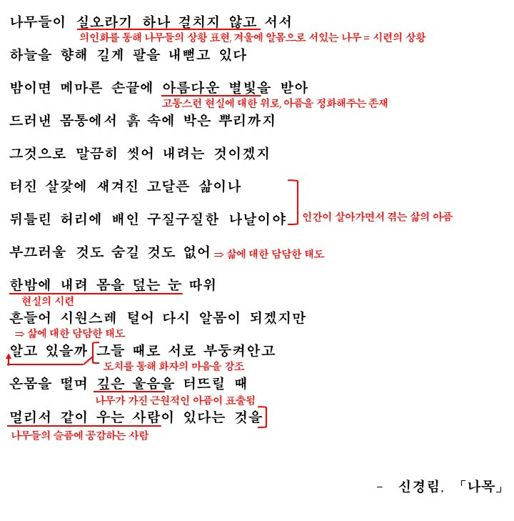 이번에 다룰 작품은 신경림 시인의 '나목'입니다. '나목'은 잎이 지고 가지만 앙상하게 남은 나무'를 뜻하는데요. 이 '나목'을 통해 시인이 어떤 의미를 전달하고 있는지를 생각하며 시를 감상한 후 해석을 통해 학습해보도록 합시다.