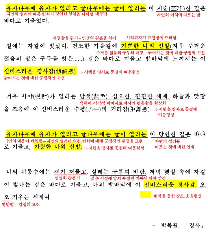이번에 다룰 작품은 박목월 시인의 '경사'입니다. 시의 제목인 '경사'는 여러분이 아는 그 경사길할 때 그 경사로 '이 길이 경사가 가파르네'라도고 많이 언급되는 단어입니다. 이러한 길의 기울기를 통해 시인이 어떤 것을 나타내려하는지를 생각하며 작품을 감상하고 해석을 통해 학습해보도록 합시다.