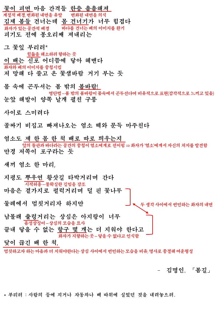 이번에 다룰 시는 김명인 시인의 '봄길'입니다. 이 시는 처음읽으면 살짝 난해할 수 있는데요. 그 이뉴는 김제 봄 들판을 건너는 화자와 바다를 건너는 배의 이미지를 중첩시켜 화자의 내면을 드러내며 시상을 전개하고 있기 때문입니다. 화자의 정서에 집중하여 시를 감상한 후 해석을 통해 학습해보도록 합시다.