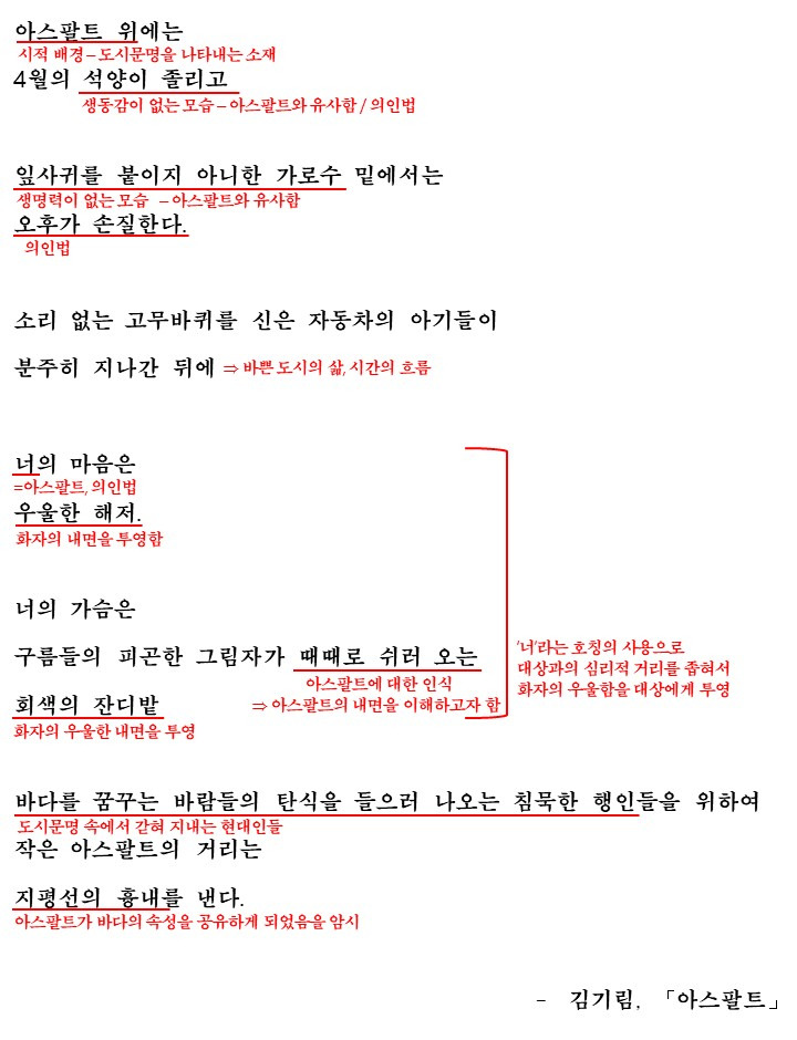 시의 처음에서는 아스팔트가 구체적인 시적 배경으로 제시되며 4월의 졸린 석양, 잎사귀를 붙이지 아니한 가로수와 같이 생명령 없는 모습과 연관되어 생명력없는 모습으로 제시됩니다. 그리고 3연에서 분주한 도시인들의 모습을 보여준 후 아스팔트를 '너'라고 부르며 심리적 거리를 좁혀 아스팔트에게 화자의 우울함을 투영하는데요. 이렇게 '너'라고 칭하고 나서 화자는 아스팔트의 내면을 이해하고자 하며 아스팔트가 '구름들의 피곤한 그림자가 때때로 쉬러오는 회색의 잔디밭'이라며 우울하지만 쉴 수 있는 누군가를 위해주는 속성을 가지고 있다고 생각합니다.