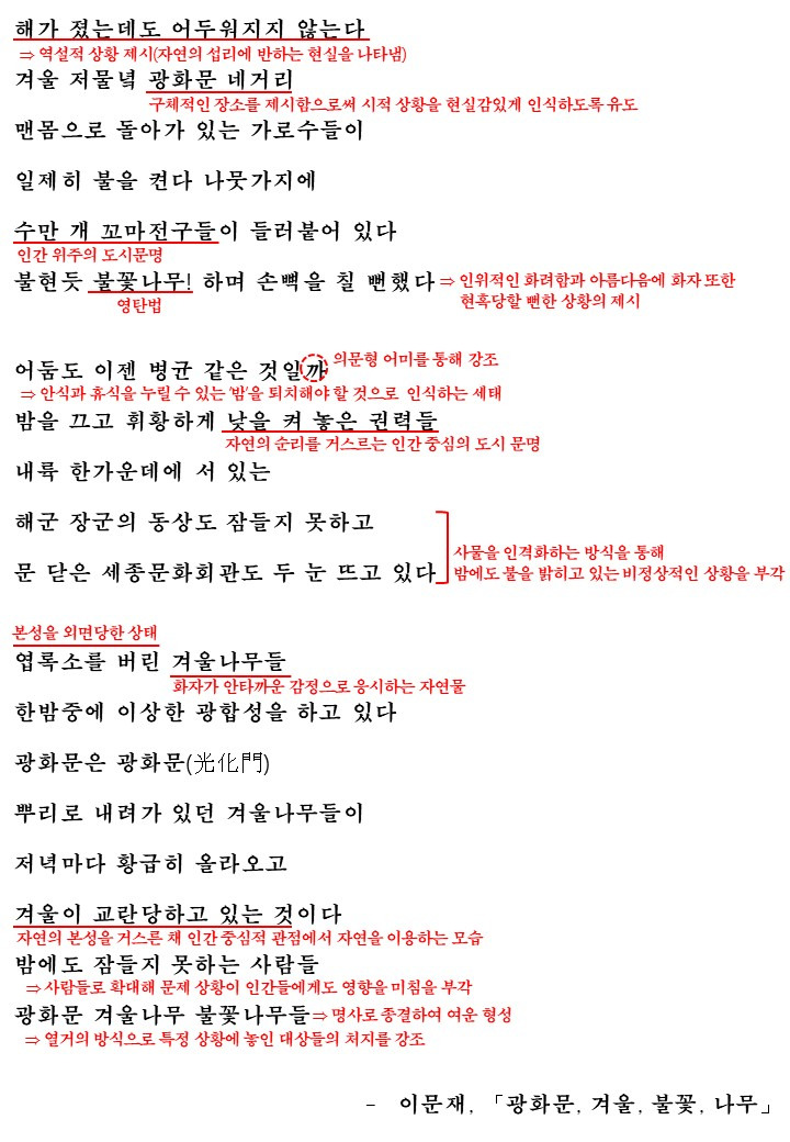 3연에서는 엽록소를 버린 겨울나무들이 한밤중에 이상한 광합성을 하는 모습을 보여주는데요. 본성을 외면당한(엽록소를 버린) 겨울나무들이 도시 문명의 불빛으로 광합성을 하는 모습을 이상하다고 표현하며 화자가 느끼는 안타까움을 나타냅니다. 그리고 광화문을 발음이 같은 한자를 이용해 광화문(光化門)이라고 표현하며 자연의 섭지에 반하는 도시 문명에대해 나타내며 '겨울이 교란당하고 있는 것'이라며 자연의 본성을 거스른 채 인간 중심적 관점에서 자연을 이용하는 모습에 대해 비판적인 시선을 보여줍니다. 이러한 상황에서 '밤에도 잠들지 못하는 사람들'이라며 나무의 문제를 사람들에게 확대해 이러한 문제 상황이 인간들에게도 영향을 미치고 있음을 부각시킵니다. 그리고 이후 광화문 겨울나무 불꽃나무들이라며 열거의 방식으로 이러한 상황에 놓인 대상들의 처지를 강조하며 시가 마무리됩니다.