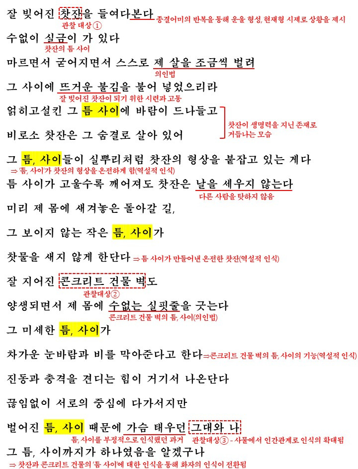 마지막으로 다시 한 번 관찰의 대상이 변하는데요. 이번에는 '그대와 나'로 사물에서 인간관계로 인식이 확장됩니다. 끊임없이 서로의 중심에 다가서지만 벌어진 틈, 사이 때문에 가슴 태우던 그대와 나에서 '가슴 태우던'에서 알 수 있는 점은 예전에는 틈, 사이를 부정적으로 여겼다는 점입니다. 이러한 예전의 인식을 새로운 인식에 의해 '그 틈, 사이까지가 하나였음을 알게 되며' 인식의 전환이 일어나고 화자는 틈을 지닌 하나가 깊이 있는 관계를 만들어 낸다며 수많은 실금의 틈, 사이를 허용하고 네 노여움의 불길과 내 슬픔의 눈물이 스며들 수 있게 실뿌리 깊숙히 내리는 것일지도 모를 일이라고 생각하며 시가 마무리됩니다.