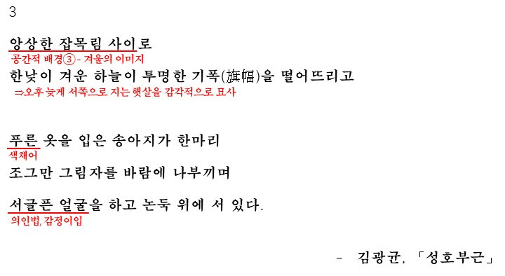 3에서 화자는 6연의 '앙상한 잡목림'에서 알 수 있듯 잠목림 사이로 이동해서 오후의 하늘을 보는 데요. 오후 늦게 서쪽으로 지는 햇살을 투명한 기폭이라고 묘사 한 후 논둑 위에 서 있는 송아지를 서글픈 얼굴이라며 감정이입을 하며 시를 마무리합니다.(마지막에 화자가 서글픈 감정을 지니고 있는 것을 알 수 있습니다.)