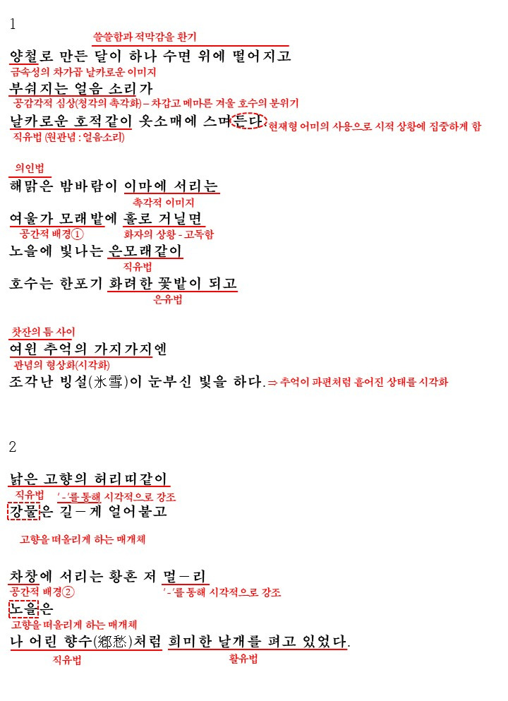 먼저 1에서 화자는 2연의 '여울가 모래밭'을 보면 알 수 있듯이 '호숫가'에 위치하고 있습니다. 이 곳에서 화자는 양철로 마든 달이 하나 수면 위에 떨어지고 부숴지는 얼음 소리가 날카로운 호적같이 옷소매에 스며든다며 비유를 통해 차가운 겨울 호수의 모습을 말합니다. 그리고 이어 호수를 노을에 빛나는 은모래, 화려한 꽃밭으로 직유와 은유를 통해 묘사하지만 화자는 이런 호수를 홀로 거니는 고독한 상황에 있습니다. 그리고 이렇게 혼자 거닐다 화자는 '여윈 추억의 가지가지엔 조각난 빙설이 눈부신 빛을 한다'며 추억이 흩어진 상태를 시각적으로 표현하며 추억 속에 어떤 영상을 떠올립니다.