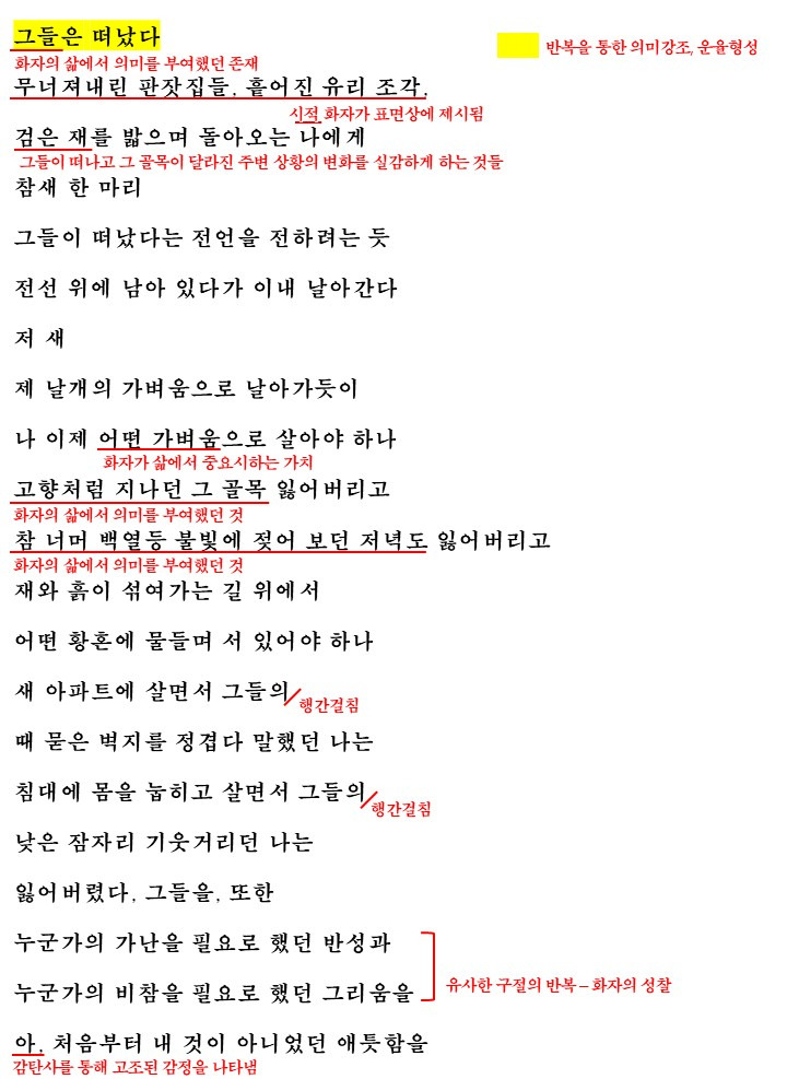 이렇게 이 시는 '그들이 떠난 후 과거 자신의 행동에 대한 성찰과 삶의 태도에 대한 고민'을 나타내고 있습니다.
