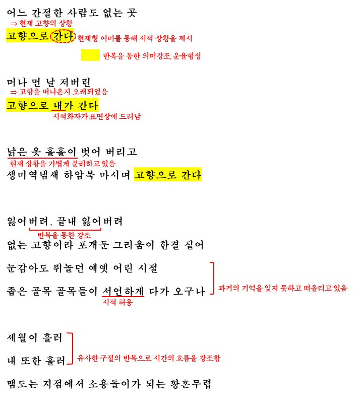 이렇게 이 시는 '고향에 대한 그리움과 귀향에의 의지'를 드러내고 있는데요. 이를 반복을 통한 의미강조, 현재형 어미를 통한 시적 상황의 제시, 부사어를 이용한 감정의 강조, 시적 허용 등을 통해 효과적으로 드러내고 있습니다.