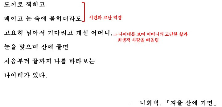 그 후 도끼로 도끼로 찍히고 베이고 눈 속에 묻히더라도 고요히 남아서 기다리고 계신 어머니라며 어머니의 희생적이고 변함없는 사랑을 떠올립니다.