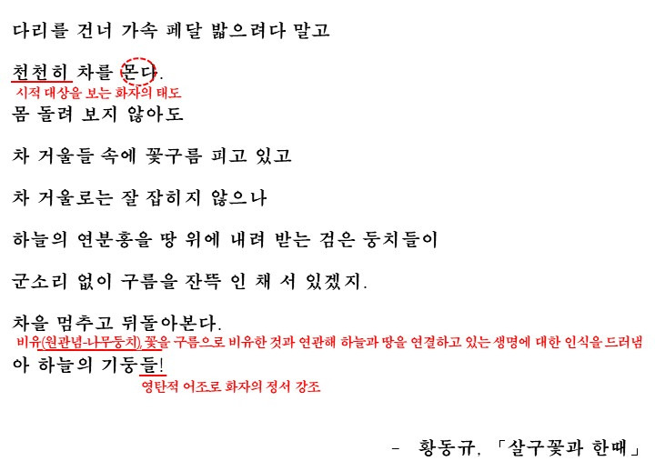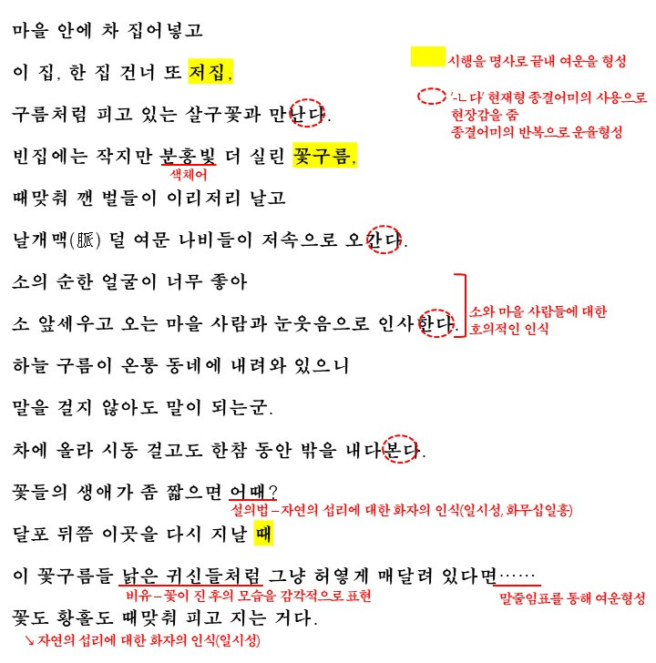 그리고 다시 차에 올라 시동을 결거도 한참동안 밖을 내다보는데요. 그러면서 화자는 이렇게 생각합니다. "꽃들의 생애가 좀 짧으면 어때?"라고 말이죠. 이는 이미 화자가 꽃들의 생애가 짧음을 알고 있으면서도 말하는 것으로(설의법) 이러한 일시성이 자연의 섭리라는 화자의 인식을 보여줍니다.(관련 한자 - 화무십일홍(花無十日紅) 그리고 달포 뒤즘 이곳을 다시 지날 때는 이 꽃구름들이 낡은 귀신들처럼 그냥 허옇게 매달려 있다면......라고 가정하면서도 이를 꽃도 황홀도 때맞춰 피고 지는 거다라며 자연의 섭리에 대한 자신의 인식을 드러냅니다.