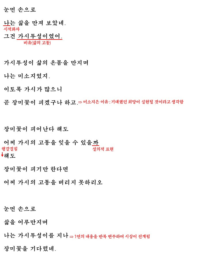 화자는 장미꽃이 피어난다해도 과거의 고통을 잊을 순 없겠다고 알고 있지만 장미꽃이 피어 난다면 가시의 고통을 버릴 수 있을 것이라며 인고의 세월을 견디며 기대했던 희망이 실현되기를 기다립니다. 그리고 4연에서 1연의 내용이 반복 변주되며 장미꽃을 기다리는 애타는 마음이 표현됩니다.
