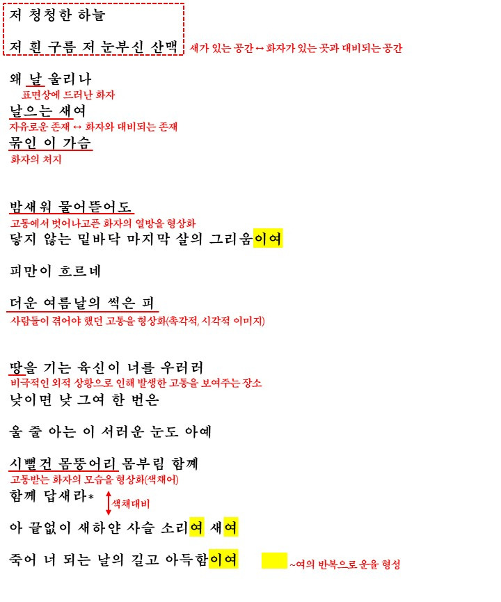 시를 읽고 나면 화자는 자유롭게 하늘을 노니는 새를 보면서 자유를 빼앗긴 현실에 절망하며 자유에 대한 간절한 갈망을 드러내고 있는 것을 알 수 있는데요. 화자는 고통스러운 자신의 상황과 대비되는 새를 통해 자신의 절망적 상황을 부각합니다.