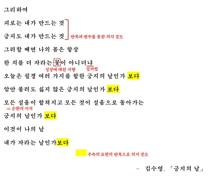 그래서 화자는 주체적으로 피로도 긍지도 자신이 만드는 것이라며 이러한 활동을 통해 성장하며(한 치를 더 자라는 꽃) 자신의 삶과 감정의 주인이 자신임을 드러냅니다. 그리고 이를 '순환의 원리'처럼 여러가지를 합친 긍지의 날이라고 보며 이를 '긍지'라는 가치로 만들어냅니다. 설움이 협쳐지고 모든 것이 설움으로 돌아가는 것처럼 설움을 피하는 것이 아닌 삶에 존재한다는 점을 인정하며 이를 재료 삼아 긍지로 승화시키며 성장하고 있는 모습을 보여줍니다.