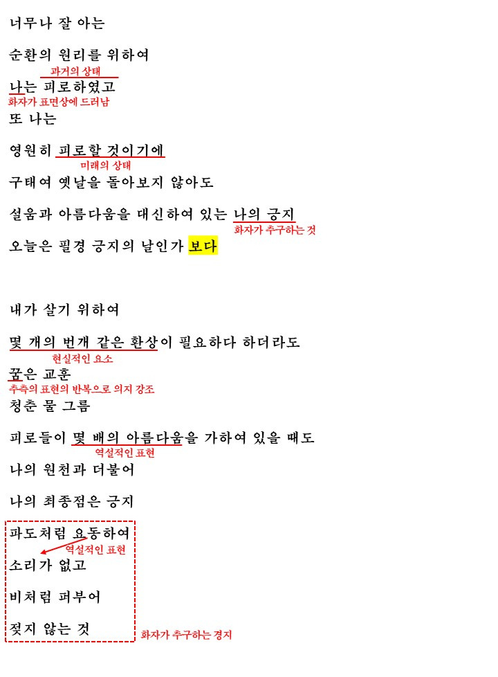 화자는 살기 위해서 몇 개의 번개 같은 환상(현실적인 요소)이 필요하다 하더라고요 꿈은 교훈이고 청춘이고 물이고 구름이니 피로들이 몇 배의 아름다움을 가하였을 때도(역설적인 표현-피로를 아름다움이라고 인식) 자신의 원천과 더불어 최종점은 긍지라고 인식하는 모습을 보여줍니다.