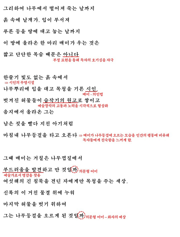 시는 매미가 우는 이유에 대해 물으면서 시작합니다. '나무에서 떨어저 죽는 날까지~흙 속에서 날개가, 입이 부서져, 푸른 등을 땅에 대고 눕는 날까지~'라며 매미가 죽는 날에 대해 구체적으로 묘사한 후 매미가 우는 것은 짧고 단단한 목슴 때문은 '아니다'라는 부정표현을 통해서 독자의 호기심을 자극합니다.