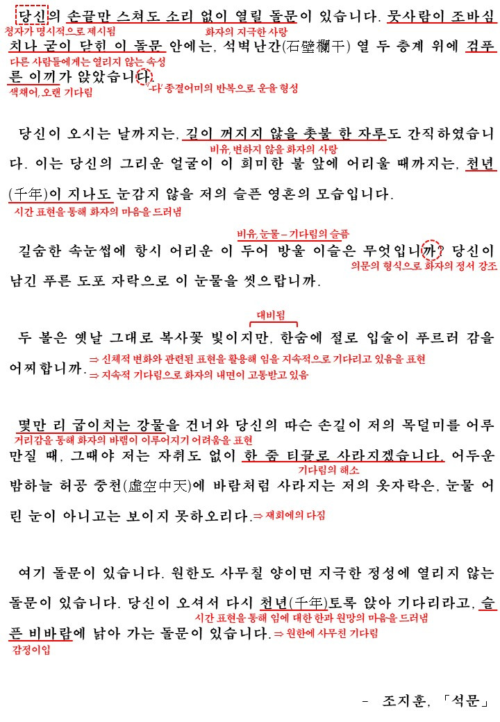 6연에서는 다시 돌문이 등장하는데요. '원한이 사무칠 양이면 지극한 정성에 열리지 않는 돌문', '당신이 오셔서 다시 천년토록 앉아 기다리라며'라며 원한에 사무친 기다림을 보여줍니다. 그리고 '슬픈 비바람에 낡아가는 돌문'이라는 표현을 통해 화자의 기다림이 얼마나 고통스럽고 오래되었는지를 보여주며 시가 마무리되비다. 이렇게 해서 이 시는 1~4연에서 풍상에 시달려 온 돌문의 모습을 통해 천녀의 한을 간직한 여인의 서러움을 5~6연에서는 '당신'과의 해후에 대한 다짐과 원한을 노래하며, 버림받은 여인의 기다림과 한에 대해 이야기합니다.