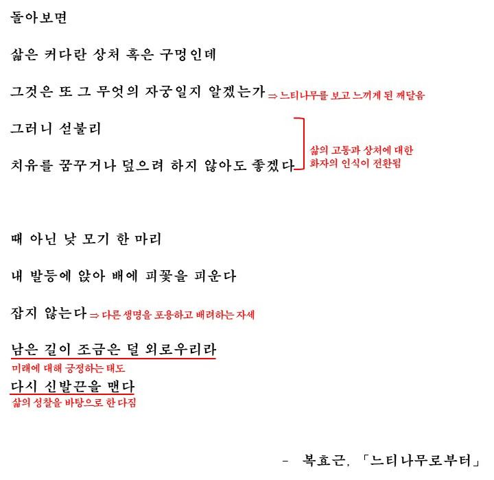 결론적으로, '느티나무로부터'는 느티나무의 모습을 통해 삶의 상처가 새로운 생명과 의미를 낳는 자리가 될 수 있다는 깊은 통찰을 담아낸 시입니다.