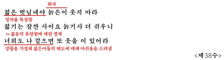 - 제38수: 젊은이들에게 **'젊음은 잠깐이요, 늙기는 더 쉽다'**며 훈계합니다. 이는 젊음이 유한하다는 점을 경계하고, 늙음을 조롱하지 말 것을 당부하는 내용입니다. 삶의 순리를 깨달은 노년의 지혜가 엿보입니다.