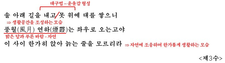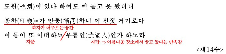 - 제14수: 화자는 자신이 사는 곳을 전설 속 이상향인 '도원(桃園)'에 비유하며, 스스로를 '무릉인'이라 칭합니다. 이는 현실의 공간이 이상향만큼이나 아름답다는 만족감을 드러내는 것입니다.