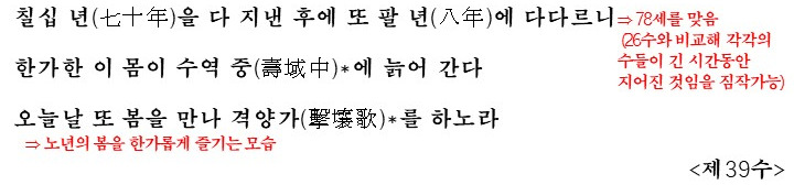 - 제39수: 화자의 나이가 78세에 이르렀음을 밝히며, 장수하고 있다는 만족감을 표현합니다. '격양가(태평성대를 노래하는 노래)'를 부르는 모습은 노년의 삶에 대한 여유와 평온함을 보여줍니다. 이는 62세의 나이에 보였던 장수에 대한 욕망보다 훨씬 달관한 태도입니다.