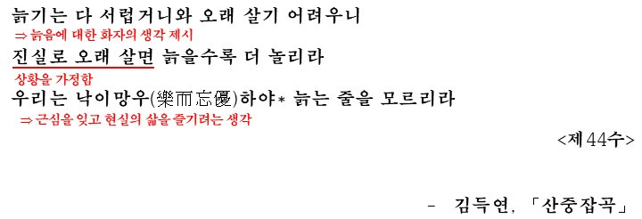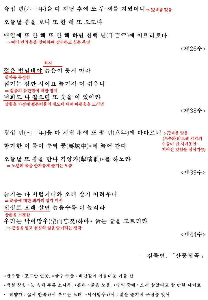 '산중잡곡'은 이처럼 자연 속에서의 삶의 흥취와 늙음에 대한 감회를 진솔하게 노래하며, 노년의 삶을 즐기며 살아가는 화자의 낙천적이고 달관적인 태도를 잘 보여주는 작품입니다.