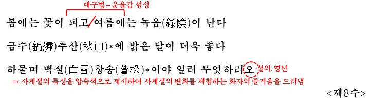 - 제8수: 봄, 여름, 가을, 겨울 사계절의 아름다움을 압축적으로 표현합니다. '금수추산(비단 같은 가을 산)', '백설창송(눈 속 푸른 소나무)'과 같은 시어는 자연의 아름다움을 시각적으로 생생하게 전달하며, 자연을 즐기는 화자의 흥취를 강조합니다.